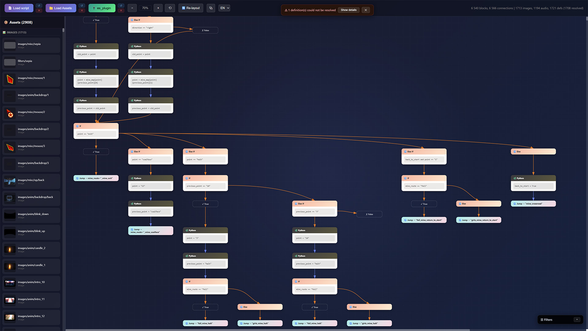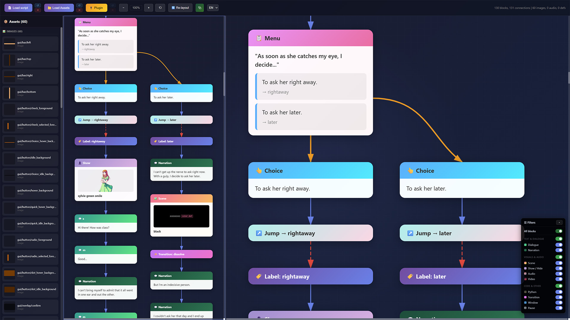 - shows script files as a visual layout of connected blocks (virtually all standard RenPy blocks are supported). Branches, jumps, choices - you can trace all the possible paths of your script,
